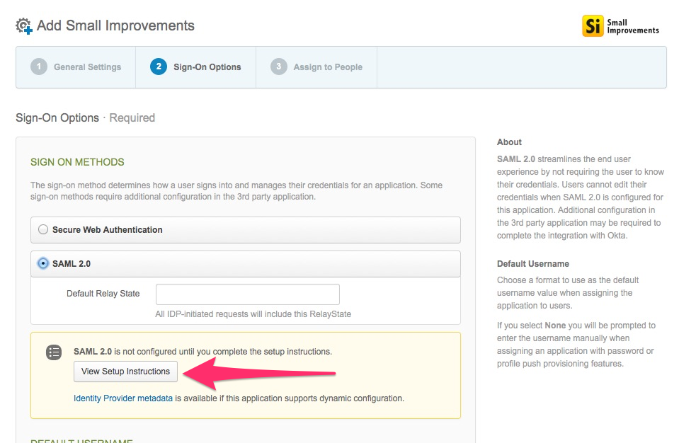 Once configured, your staff can either access Small Improvements from the Okta dashboard or, if they access Small Improvements via your subdomain. The Okta integration is only for SSO. We do not automatically synchronize your user accounts between systems.
