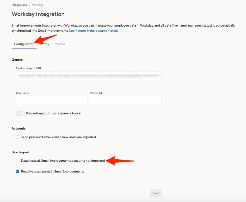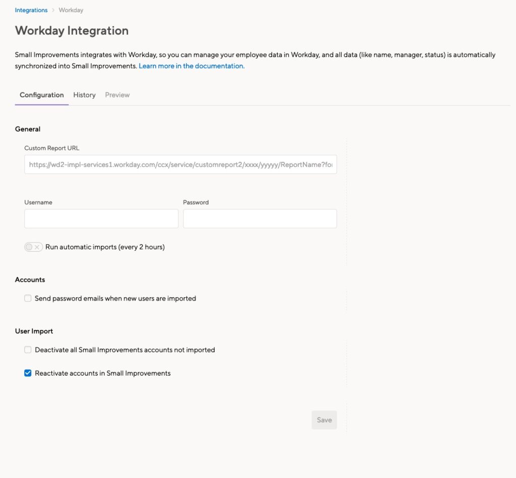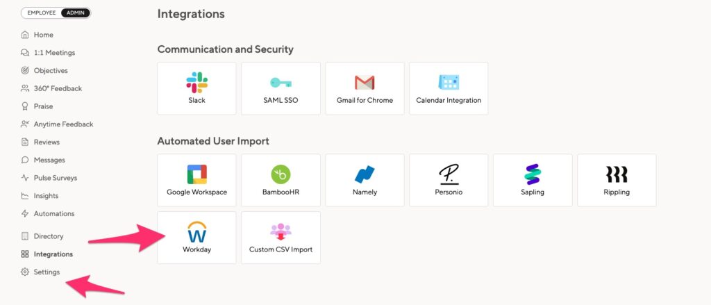 The primary benefit of the Workday integration in Small Improvements is that you are able to import your high-level employee information, plus reporting structure, directly into your Small Improvements account.